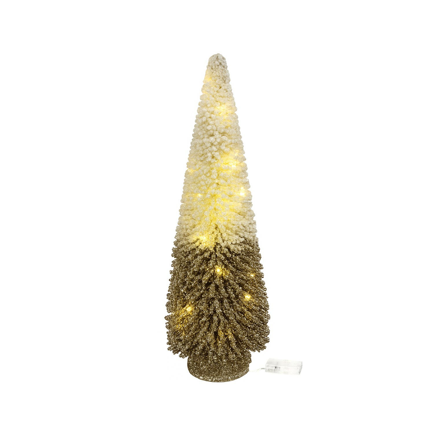 Su diseño presenta un sofisticado degradé que va desde una base en tono dorado glitter hasta una copa blanca con efecto nevado. La textura de sus ramas simula la escarcha invernal, creando un brillo especial que se potencia al encender sus luces.