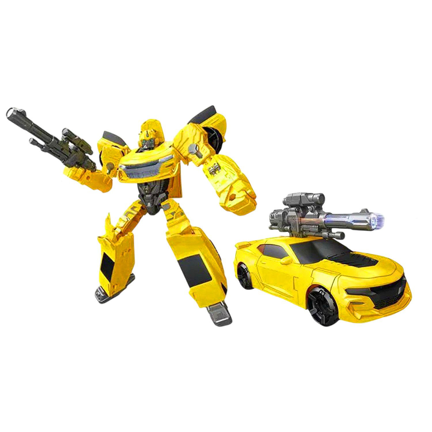 Prepárate para la emoción con nuestro increíble juguete transformable. Este dinámico robot se convierte en un veloz coche deportivo amarillo, brindando una experiencia de juego versátil y llena de adrenalina. Equipado con un arma, este guerrero está listo para cualquier misión.