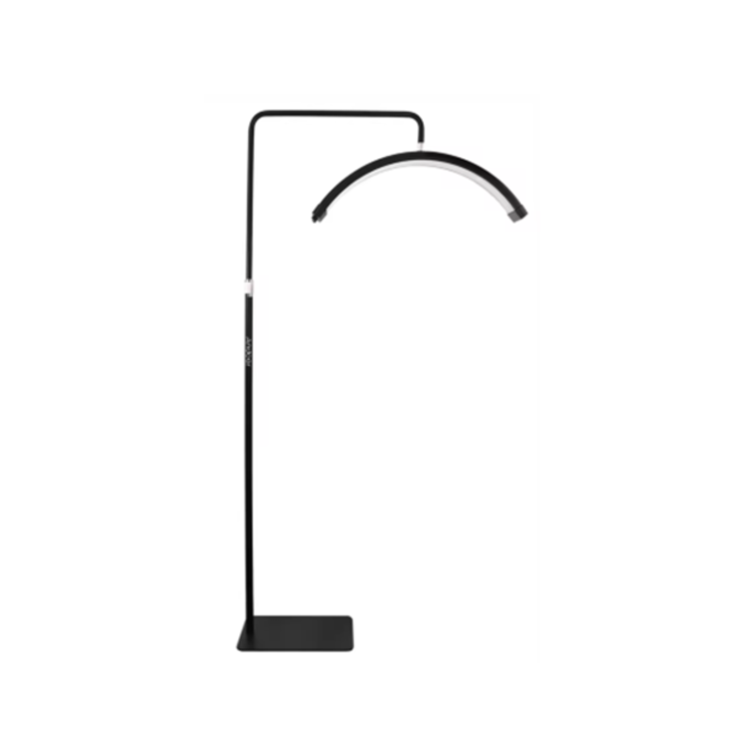 Medidas y Especificaciones: La lámpara tiene una altura total de 160 cm y un brazo superior de 45 cm de largo. El cabezal de media luna tiene un ancho de 66 cm y se posiciona a una altura de 110 cm desde la base. Está fabricada en metal resistente con acabado negro mate de alta calidad. Es ideal para estudios de belleza, consultorios y creadores de contenido que buscan un acabado profesional en sus trabajos.