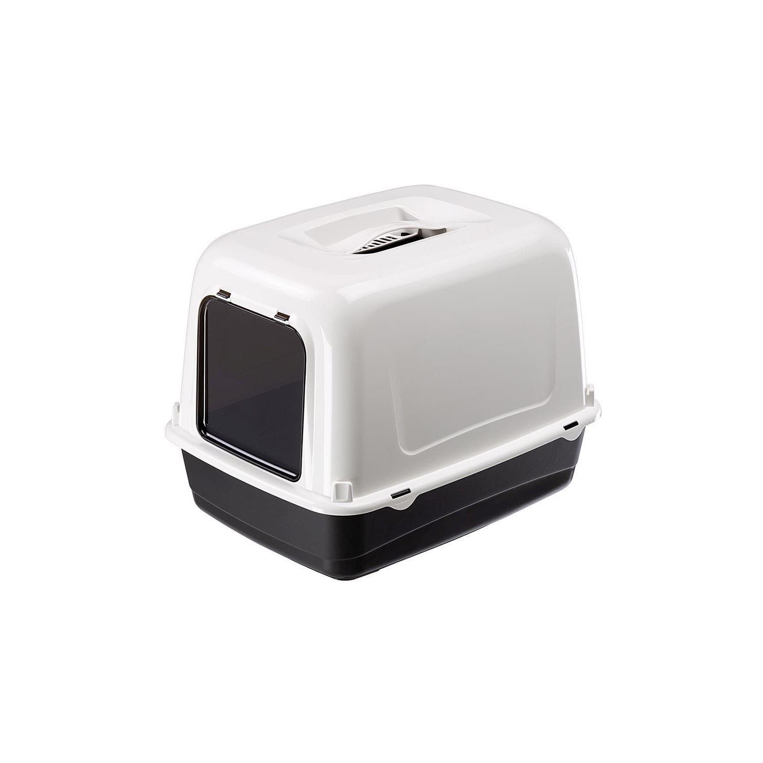El modelo Ariel 10 Home es una caja cerrada construida en plástico sólido y completa con puerta oscilante oscurecida. Se compone de 2 fondos, uno cerrado y otro con un tamiz para permitir que se separe la arena, así como una tapa con un práctico asa de transporte.