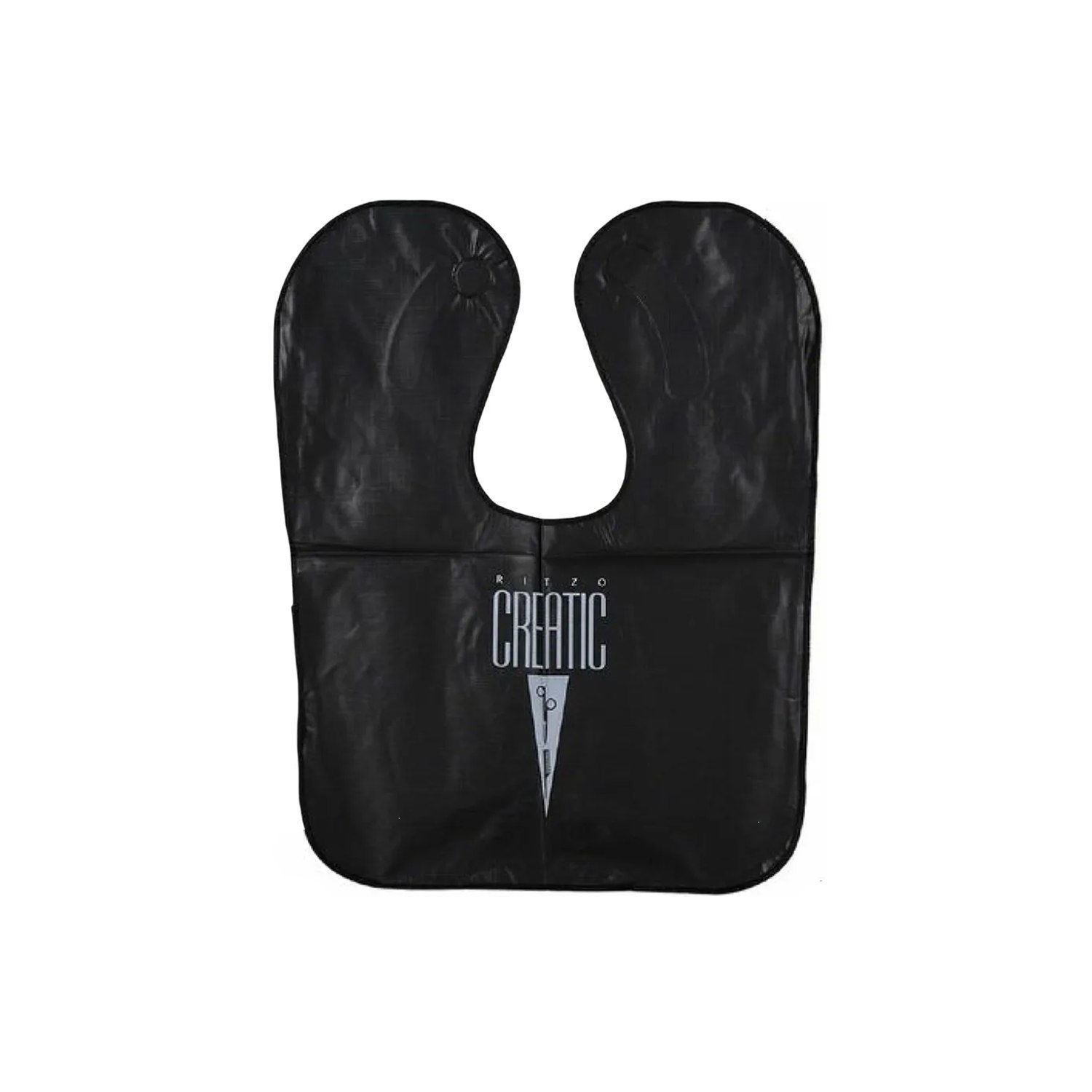 Su material de alta calidad es impermeable y resistente a las manchas, asegurando que los productos de coloración, tratamientos químicos y cabello cortado se mantengan lejos de la ropa del cliente. El diseño incluye un atractivo estampado RITZO CREATIC con motivos de tijeras que añaden un toque profesional y distintivo.